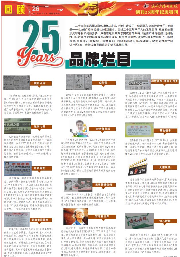 二十五年的風(fēng)雨、輝煌、磨煉、成長(zhǎng),把她打造成了一位婀娜多姿的妙齡女子。她就是——《達(dá)州廣播電視報(bào)(達(dá)州新報(bào))》。走過二十五年不平凡的發(fā)展歷程,現(xiàn)在的她更加光彩奪目和絢麗多姿。厚載著達(dá)州數(shù)萬(wàn)忠實(shí)讀者的期待,《達(dá)州廣播電視報(bào)(達(dá)州新報(bào))》經(jīng)過幾次大的新聞改革和報(bào)紙改版,報(bào)紙的可讀性、地域性、服務(wù)性得到了不斷的增強(qiáng),孕育出了《詩(shī)凡話題》等一大批讀者喜聞樂見的優(yōu)秀品牌欄目。