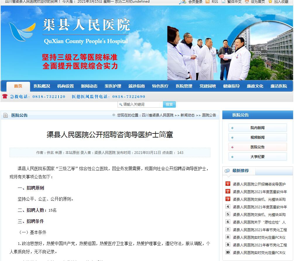 達聘網(wǎng)(www.0818rc.net)達州人才網(wǎng)訊,渠縣人民醫(yī)院系國家“三級乙等”綜合性公立醫(yī)院,因業(yè)務(wù)發(fā)展需要,現(xiàn)面向社會公開招聘咨詢導(dǎo)醫(yī)護士,現(xiàn)將有關(guān)事項公告如下: