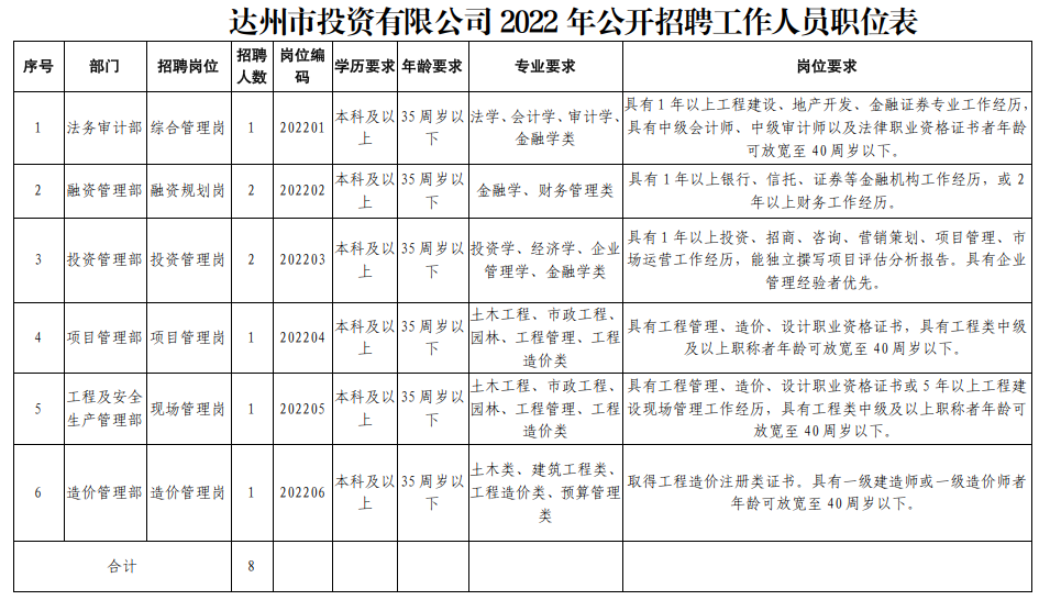 本次公開招聘設(shè)置崗位6個,擬招聘工作人員8人,其中:法務(wù)審計部1人、融資管理部2人、投資管理部2人、項目管理部1人、工程及安全生產(chǎn)管理部1人、造價管理部1人。